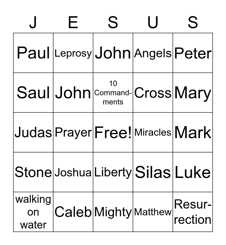 This bingo card has a free space and 24 words: Joshua, Caleb, 10 Command- ments, walking on water, Peter, Paul, Saul, Leprosy, Miracles, Liberty, Cross, Judas, Silas, Luke, John, Matthew, Mark, John, Mary, Prayer, Resur-rection, Stone, Angels and Mighty.