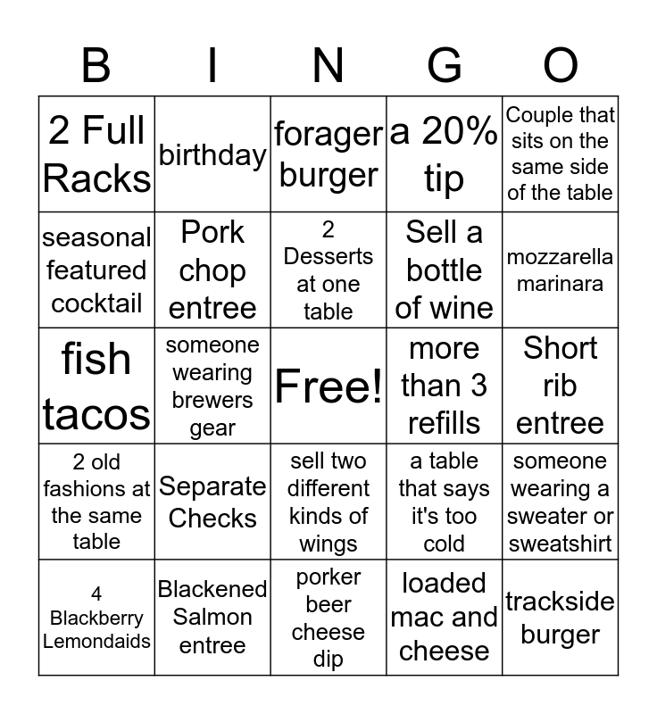 This bingo card has a free space and 24 words: Separate Checks, Blackened Salmon entree, 2 Desserts at one table, 4 Blackberry Lemondaids, Couple that sits on the same side of the table, 2 Full Racks, seasonal featured cocktail, birthday, more than 3 refills, sell two different kinds of wings, Sell a bottle of wine, fish tacos, a table that says it's too cold, someone wearing a sweater or sweatshirt, Pork chop entree, loaded mac and cheese, Short rib entree, forager burger, mozzarella marinara, someone wearing brewers gear, trackside burger, 2 old fashions at the same table, a 20% tip and porker beer cheese dip.