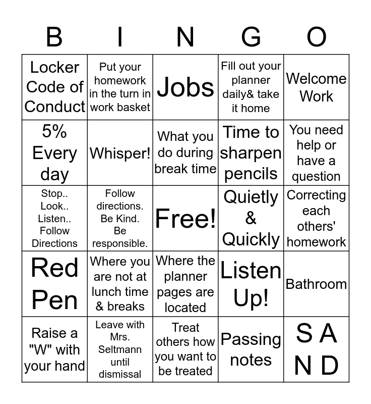 This bingo card has a free space and 24 words: Where you are not at lunch time & breaks, Leave with Mrs. Seltmann until dismissal, What you do during break time, Raise a "W" with your hand, Welcome Work, Locker Code of Conduct, 5% Every day, Put your homework in the turn in work basket, Quietly & Quickly, Where the planner pages are located, Time to sharpen pencils, Stop.. Look.. Listen.. Follow Directions, Listen Up!, Bathroom, Whisper!, Passing notes, Correcting each others' homework, Jobs, You need help or have a question, Follow directions. Be Kind. Be responsible., S A N D, Red Pen, Fill out your planner daily& take it home and Treat others how you want to be treated.