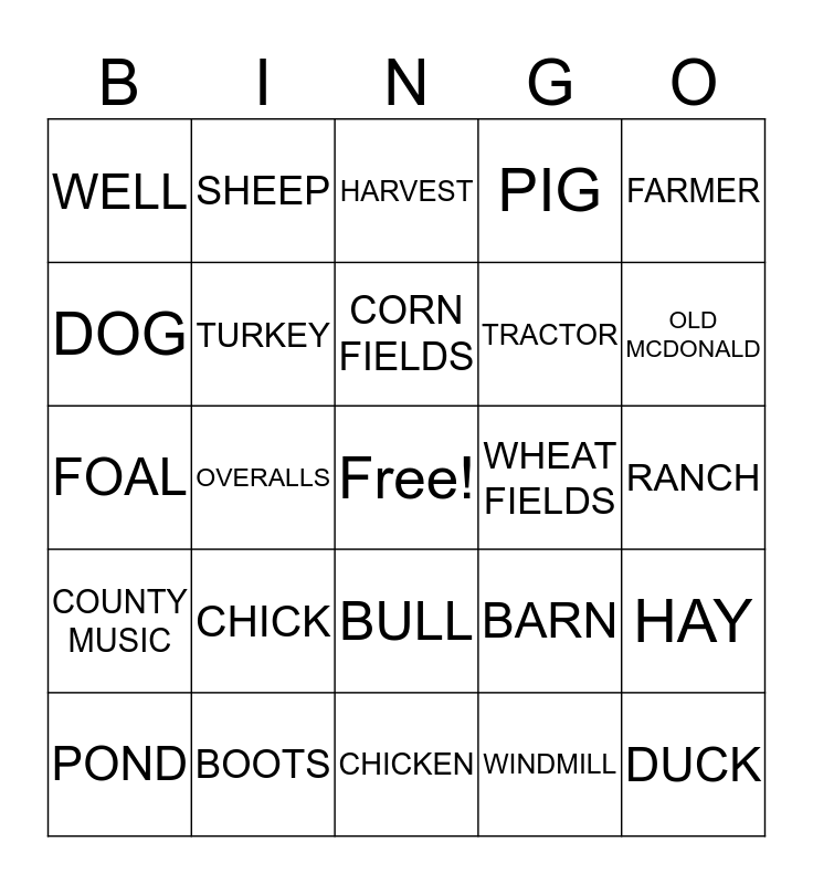 This bingo card has a free space and 49 words: HORSE, DUCK, HEN, CHICKEN, CHICK, COW, SHEEP, ROOSTER, DOG, GOAT, TURKEY, PIG, HAY, BARN, JOHN DEERE, PASTURE, CORN FIELDS, WHEAT FIELDS, CROPS, FARMER, OVERALLS, WINDMILL, WELL, TRACTOR, PLOW, OLD MCDONALD, POND, DUCK, BULL, COUNTY MUSIC, STABLE, TROUGH, SCARECROW, FLANNEL, BOOTS, STRAW HAT, SOYBEANS, SILOS, RANCH, ACRE, CALF, COOP, DONKEY, EGG, FOAL, HARVEST, HERD, PUMPKIN and LLAMA.