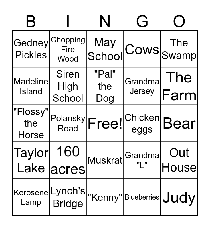 This bingo card has a free space and 24 words: Kerosene Lamp, 160 acres, "Pal" the Dog, Blueberries, The Swamp, Gedney Pickles, Chopping Fire Wood, May School, Chicken eggs, Bear, "Flossy" the Horse, Siren High School, Grandma "L", Out House, Madeline Island, Lynch's Bridge, "Kenny", Cows, The Farm, Taylor Lake, Polansky Road, Muskrat, Grandma Jersey and Judy.