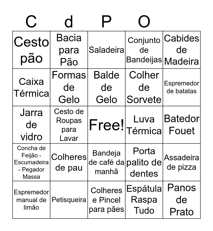 This bingo card has a free space and 63 words: Abridor de Latas, Afiador de faca, Assadeiras bolo, Assadeira de pizza, Avental, Açucareiro, Bacia para Pão, Balança de Cozinha, Balde de Gelo, Balde, Bandeja de café da manhã, Batedor de carne, Batedor Fouet, Cabides de Madeira, Caixa para Remédio, Caixa Térmica, Cesto de Roupas para Lavar, Cesto pão, Coador, Colher de Sorvete, Colheres de pau, Concha de Feijão - Escumadeira - Pegador Massa, Conjunto de Bandeijas, Conjunto de Peneiras, Conjunto de Potes, Conjunto para detergente e esponja de louça, Copos de Medida, Cortador de Pizza, Descanso de Panela, Descascador de Legumes, Desencaroçador de azeitona, Escorredor de Arroz, Escorredor de Louça, Escorredor de Macarrão, Espremedor de batatas, Espremedor manual de limão, Espátula de bolo, Espátula Raspa Tudo, Forma de Pudim, Formas de Gelo, Jarra de vidro, Luva Térmica, Mantegueira, Panela de Pressão, Panos de Prato, Petisqueira, Porta Guardanapos, Porta palito de dentes, Porta sabão em Pó, Porta temperos, Porta-Frios, Colheres e Pincel para pães, Ralador, Rolo de Abrir Massa, Saca-Rolha, Saladeira, Saleiro, Tapete para box, Tesoura de Cozinha, Toalha de Banho, Tábua de Carne, Tábua de Passar Roupa and Vassoura - Rodo - Pá.