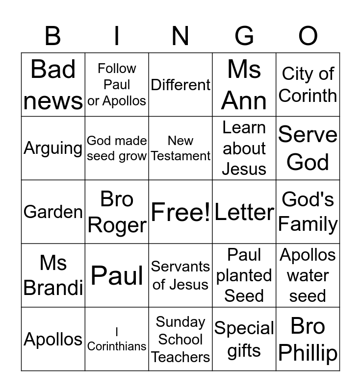 This bingo card has a free space and 24 words: Paul, I Corinthians, New Testament, Apollos, City of Corinth, Bad news, Arguing, Follow Paul or Apollos, Letter, Servants of Jesus, Learn about Jesus, Garden, Paul planted Seed, Apollos water seed, God made seed grow, Special gifts, God's Family, Different, Serve God, Bro Roger, Bro Phillip, Ms Brandi, Ms Ann and Sunday School Teachers.