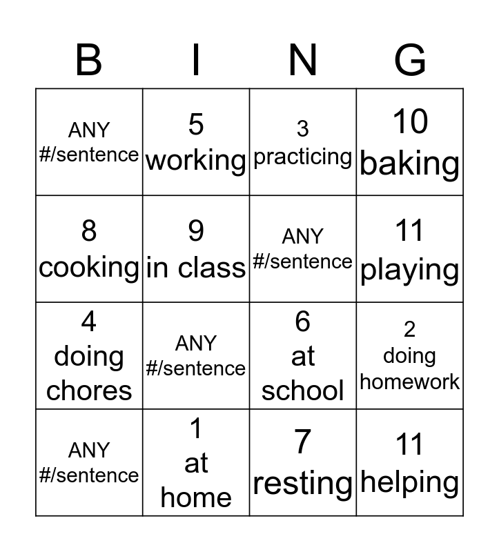This bingo card has 16 words: 1 at home, 2 doing homework, 3 practicing, ANY #/sentence, 4 doing chores, 5 working, 6 at school, 7 resting, 8 cooking, 9 in class, ANY #/sentence, 10 baking, ANY #/sentence, 11 playing, ANY #/sentence and 11 helping.