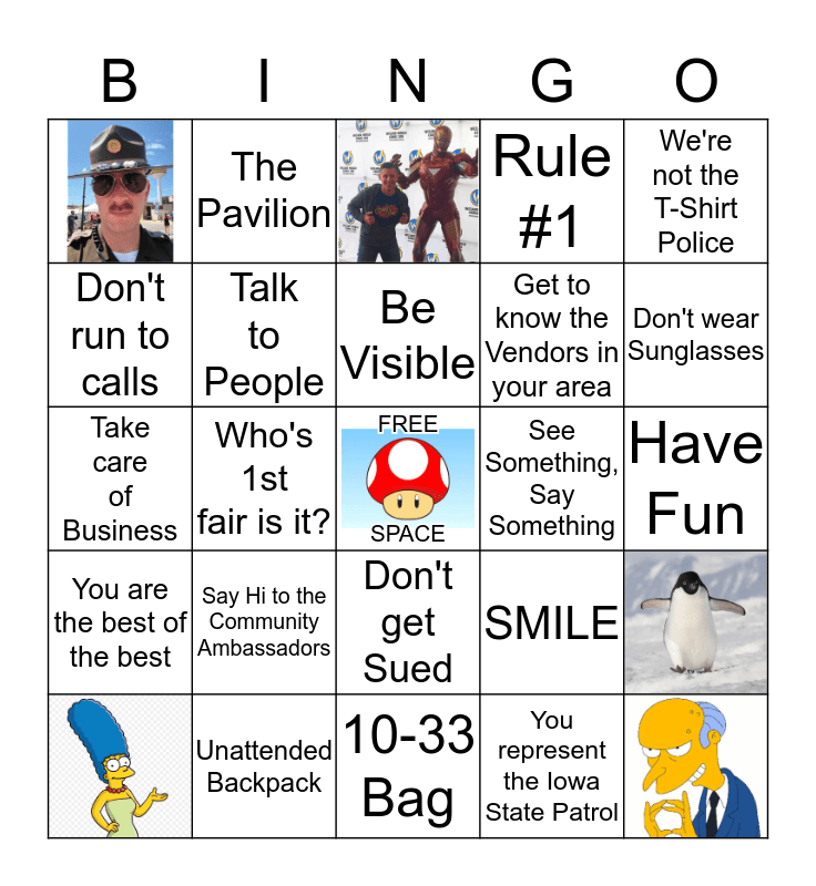 This bingo card has 5 images, a free space and 19 words: Say Hi to the Community Ambassadors, Unattended Backpack, Be Visible, We're not the T-Shirt Police, Don't run to calls, The Pavilion, See Something, Say Something, Don't get Sued, Get to know the Vendors in your area, Take care of Business, SMILE, Talk to People, You represent the Iowa State Patrol, Have Fun, Don't wear Sunglasses, Who's 1st fair is it?, You are the best of the best, Rule #1 and 10-33 Bag.