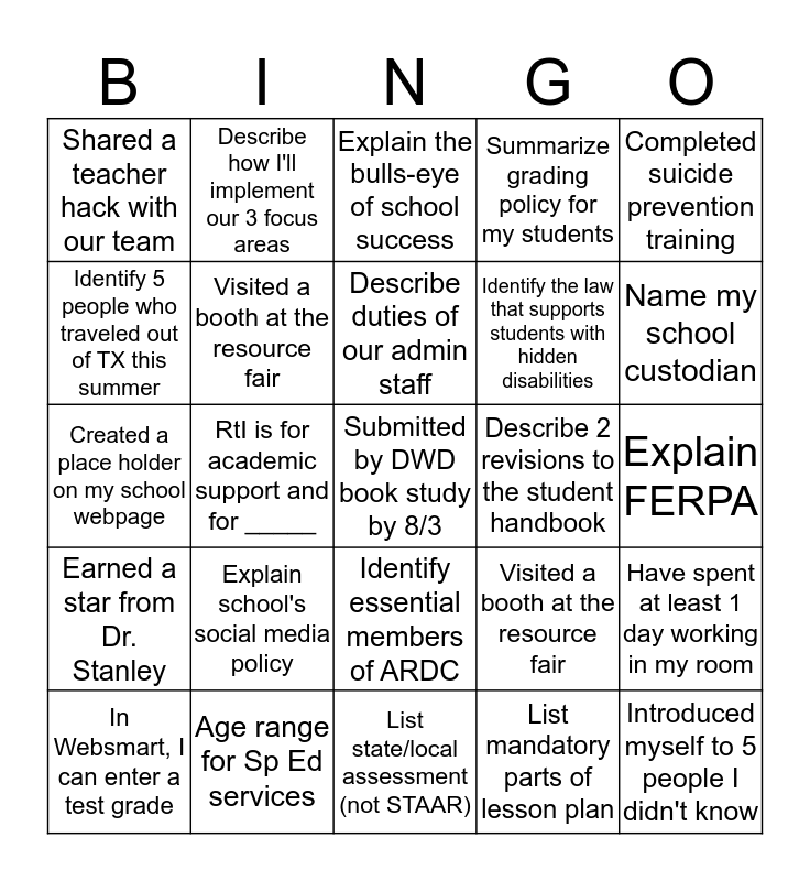 This bingo card has 30 words: Age range for Sp Ed services, 3 types of mandatory emergency drills, RtI is for academic support and for _____, What I'll do if I get an on-the-job injury, Shared a teacher hack with our team, Explain the bulls-eye of school success, Visited a booth at the resource fair, Identify essential members of ARDC, Describe 2 revisions to the student handbook, List state/local assessment (not STAAR), Explain FERPA, Submitted by DWD book study by 8/3, List mandatory parts of lesson plan, Introduced myself to 5 people I didn't know, Name my school custodian, Posted on appreciation station, Visited a booth at the resource fair, Earned a star from Dr. Stanley, Explain school's social media policy, Completed suicide prevention training, Created a place holder on my school webpage, Discuss 5 procedures I'll cover on Day 1, Describe how I'll implement our 3 focus areas, Identify the law that supports students with hidden disabilities, Identify 5 people who traveled out of TX this summer, Summarize grading policy for my students, Have spent at least 1 day working in my room, In Websmart, I can enter a test grade, Describe duties of our admin staff and List 4 evening events I'll attend.