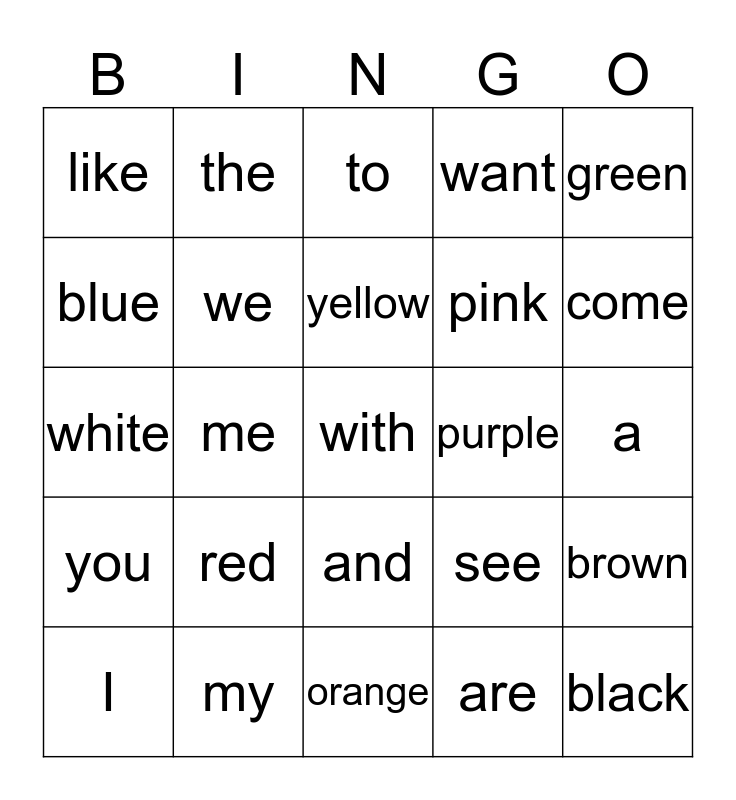 This bingo card has 25 words: red, orange, yellow, I, green, like, blue, the, purple, and, pink, white, see, brown, we, black, a, to, come, me, with, my, you, want and are.