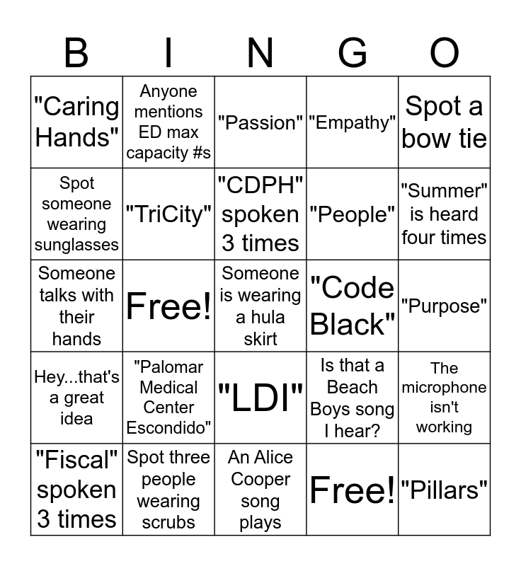 This bingo card has a free space and 24 words: "Fiscal" spoken 3 times, "Palomar Medical Center Escondido", "CDPH" spoken 3 times, Free!, Spot a bow tie, "Caring Hands", Anyone mentions ED max capacity #s, "Passion", "Code Black", "Purpose", Someone talks with their hands, "TriCity", Is that a Beach Boys song I hear?, The microphone isn't working, Spot someone wearing sunglasses, Spot three people wearing scrubs, An Alice Cooper song plays, "Empathy", "Summer" is heard four times, Hey...that's a great idea, Free!, "LDI", "People" and "Pillars".