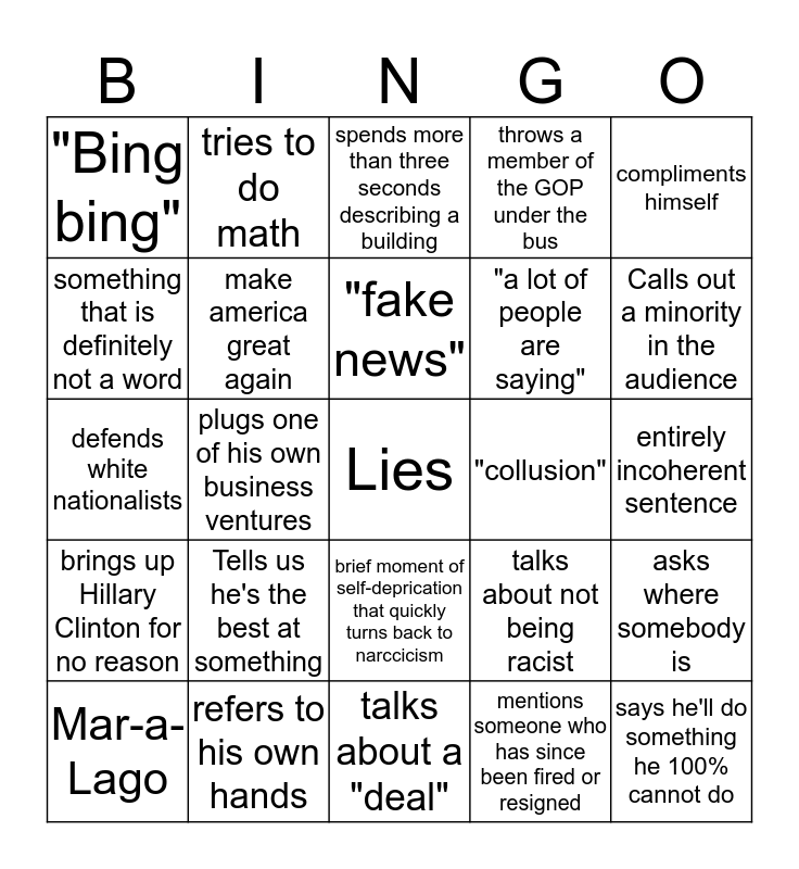 This bingo card has a free space and 38 words: lies, "big", believe me, make america great again, asks where somebody is, Tells us he's the best at something, "fake news", talking in third person, compliments himself, "a lot of people are saying", plugs one of his own business ventures, throws a member of the GOP under the bus, says he'll do something he 100% cannot do, entirely incoherent sentence, something that is definitely not a word, brings up Hillary Clinton for no reason, refers to how rich he is, spends more than three seconds describing a building, talks about golf, "collusion", "Bing bing", refers to his own hands, Calls out a minority in the audience, Mar-a-Lago, goes into a weird-whispery voice, talks about a "deal", "we're gonna do it folks", "Build the wall!", mentions ratings, Mentions crowd size, mentions one of his tweets, brief moment of self-deprication that quickly turns back to narccicism, mentions someone who has since been fired or resigned, tries to do math, "politically correct", talks about not being racist, defends white nationalists and "jobs".
