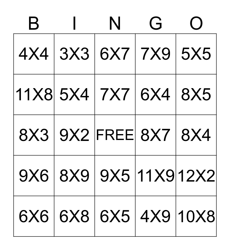 This bingo card has a free space and 24 words: 8X9, 6X8, 7X7, 6X6, 5X5, 4X4, 11X8, 3X3, 8X7, 9X5, 6X4, 8X3, 11X9, 12X2, 5X4, 4X9, 8X4, 6X7, 8X5, 9X2, 10X8, 9X6, 7X9 and 6X5.