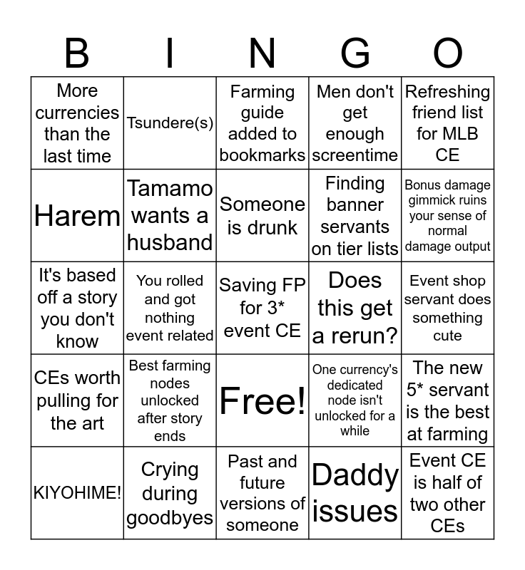 This bingo card has 26 words: Free!, KIYOHIME!, Tamamo wants a husband, Flirting with Mash, Men don't get enough screentime, Refreshing friend list for MLB CE, Harem, Tsundere(s), Someone is drunk, Daddy issues, Bonus damage gimmick ruins your sense of normal damage output, It's based off a story you don't know, Crying during goodbyes, Past and future versions of someone, Does this get a rerun?, Event CE is half of two other CEs, More currencies than the last time, Best farming nodes unlocked after story ends, Farming guide added to bookmarks, One currency's dedicated node isn't unlocked for a while, Event shop servant does something cute, CEs worth pulling for the art, You rolled and got nothing event related, Saving FP for 3* event CE, Finding banner servants on tier lists and The new 5* servant is the best at farming.
