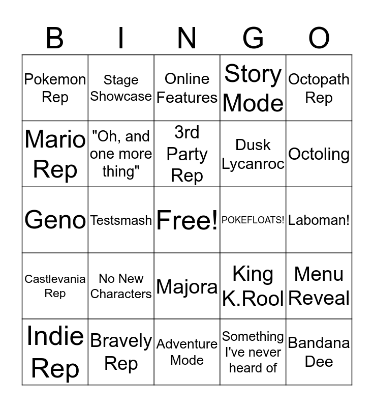 This bingo card has a free space and 24 words: No New Characters, Bravely Rep, 3rd Party Rep, Indie Rep, Octopath Rep, Pokemon Rep, Mario Rep, Stage Showcase, POKEFLOATS!, Majora, Dusk Lycanroc, Geno, King K.Rool, Menu Reveal, "Oh, and one more thing", Something I've never heard of, Laboman!, Online Features, Octoling, Testsmash, Bandana Dee, Castlevania Rep, Story Mode and Adventure Mode.