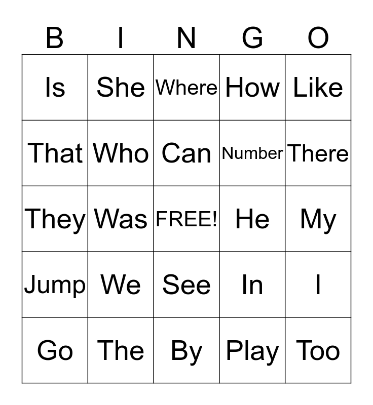 This bingo card has a free space and 24 words: We, The, Can, Go, Like, Is, That, She, He, See, Number, They, In, I, Who, Play, My, Where, There, Was, Too, Jump, How and By.