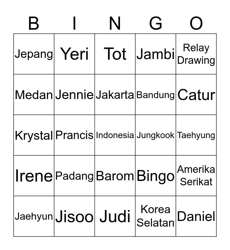 This bingo card has a free space and 24 words: Padang, Jisoo, Jakarta, Jaehyun, Relay Drawing, Jepang, Medan, Yeri, Jungkook, Barom, Bandung, Krystal, Bingo, Amerika Serikat, Jennie, Korea Selatan, Taehyung, Tot, Catur, Prancis, Daniel, Irene, Jambi and Judi.