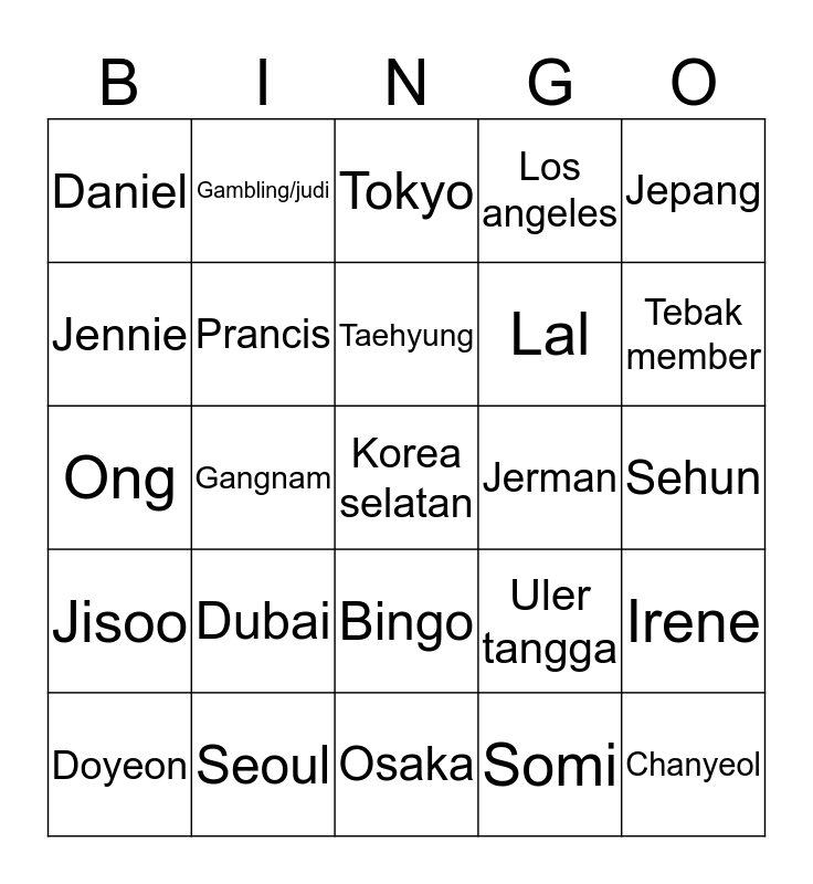 This bingo card has a free space and 24 words: Dubai, Seoul, Taehyung, Doyeon, Jepang, Daniel, Jennie, Gambling/judi, Jerman, Bingo, Lal, Ong, Uler tangga, Irene, Prancis, Somi, Sehun, Tokyo, Tebak member, Gangnam, Chanyeol, Jisoo, Los angeles and Osaka.