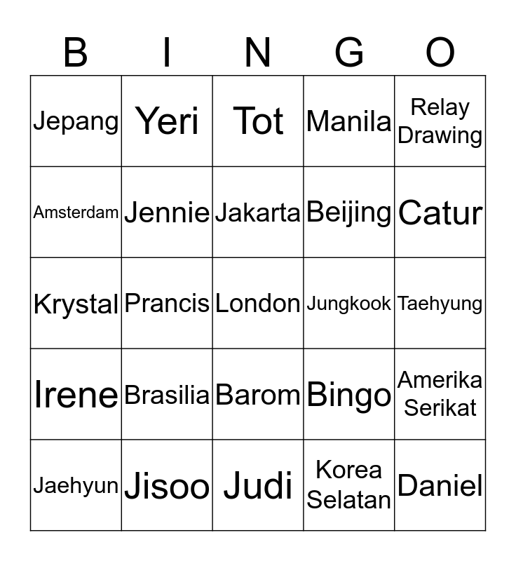 This bingo card has a free space and 24 words: Brasilia, Jisoo, Jakarta, Jaehyun, Relay Drawing, Jepang, Amsterdam, Yeri, Jungkook, Barom, Beijing, Krystal, Bingo, Amerika Serikat, Jennie, Korea Selatan, Taehyung, Tot, Catur, Prancis, Daniel, Irene, Manila and Judi.