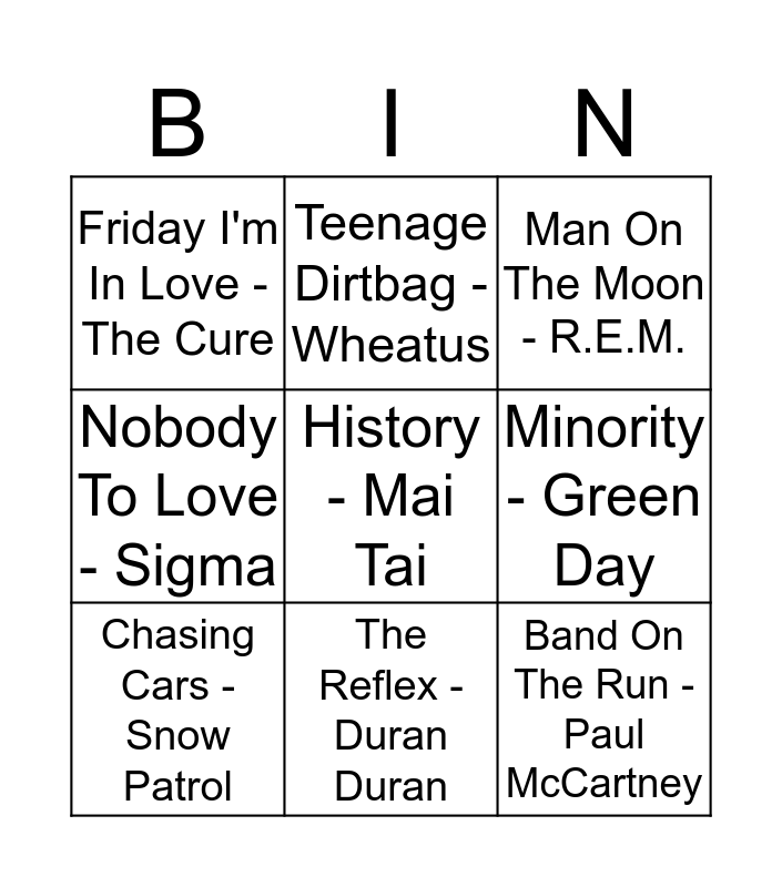 This bingo card has 30 words: Celebration - Kool & The Gang, Midnight City - M83, Lollipop - MIKA, Crazy In Love - Beyoncé, Friday I'm In Love - The Cure, Man On The Moon - R.E.M., Chasing Cars - Snow Patrol, Here Comes Your Man - Pixies, December, 1963 - Frankie Valli & The Four Seasons, Lightning Bolt - Jake Bugg, Stop Loving You - Toto, Indische Waterlelies - Efteling, The Boys Of Summer - Don Henley, Don't You (Forget About Me) - Simple Minds, Funkytown - Lipps Inc., Everybody Wants To Rule The World - Tears For Fears, Everywhere - Fleetwood Mac, Jump - Van Halen, Lessons In Love - Level 42, History - Mai Tai, Undercover Martyn - Two Door Cinema Club, Fake - Simply Red, Teenage Dirtbag - Wheatus, Band On The Run - Paul McCartney, Minority - Green Day, Nobody To Love - Sigma, Heroes - David Bowie, Easy Lover - Philip Bailey, The Reflex - Duran Duran and Livin La Vida Loca - Eddie Murphy.