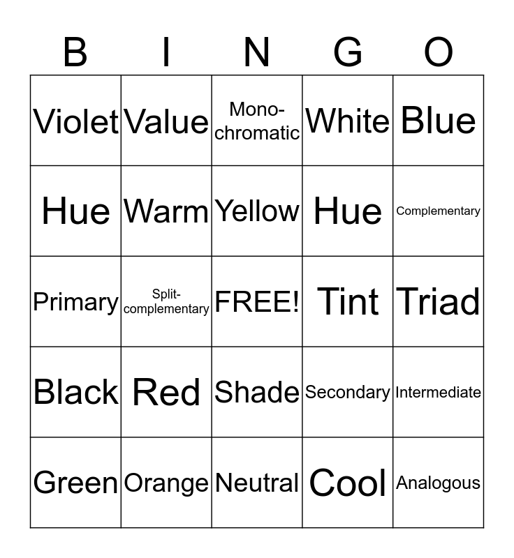 This bingo card has a free space and 24 words: Red, Orange, Yellow, Green, Blue, Violet, Hue, Value, Tint, Shade, Hue, Primary, Secondary, Intermediate, Warm, Cool, Triad, Mono-chromatic, Complementary, Split-complementary, Analogous, Black, White and Neutral.