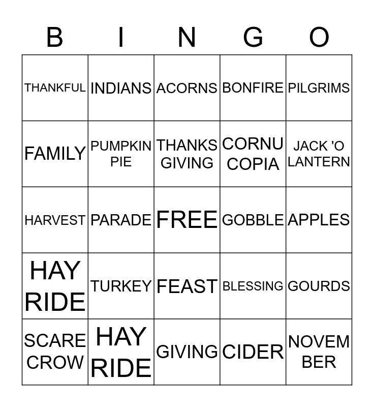 This bingo card has a free space and 24 words: TURKEY, HAY RIDE, THANKS GIVING, SCARE CROW, PILGRIMS, THANKFUL, FAMILY, INDIANS, GOBBLE, FEAST, CORNU COPIA, HARVEST, BLESSING, GOURDS, PUMPKIN PIE, CIDER, APPLES, ACORNS, JACK 'O LANTERN, PARADE, NOVEM BER, HAY RIDE, BONFIRE and GIVING.