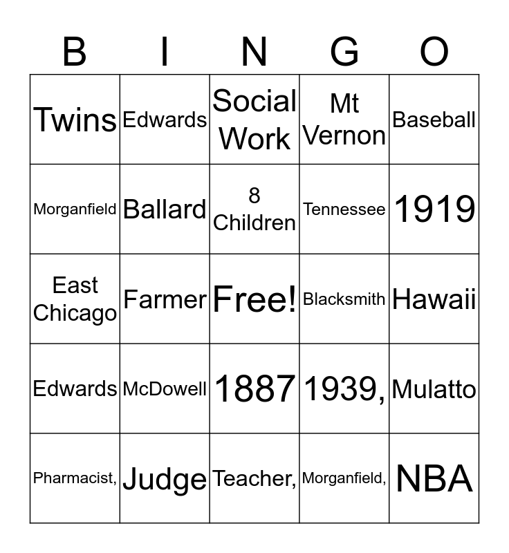 This bingo card has a free space and 38 words: Shelby County, Kentucky, East Kimball, Principal, Ballard, Mulatto, McDowell, 8 Children, Louisville, Baseball, Tennessee, Farmer, Mt Vernon, NBA, Hawaii, Morganfield, Edwards, Laundress, Social Work, 1840, Blacksmith, Twins, Judge, 1919, Pharmacist,, Carpenter,, Teacher,, Virginia,, Philadelphia Giants,, Customer Service,, Eliza,, McDowell,, 1887, Morganfield,, Edwards, Twins,, 1939,, East Chicago and Cadiz, Kentucky.