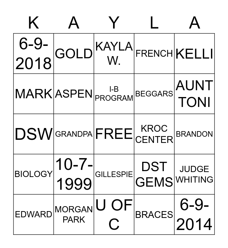 This bingo card has a free space and 24 words: 10-7-1999, MORGAN PARK, I-B PROGRAM, EDWARD, KELLI, 6-9-2018, MARK, GOLD, KROC CENTER, GILLESPIE, BEGGARS, DSW, DST GEMS, JUDGE WHITING, ASPEN, BRACES, BRANDON, KAYLA W., AUNT TONI, GRANDPA, 6-9-2014, BIOLOGY, FRENCH and U OF C.