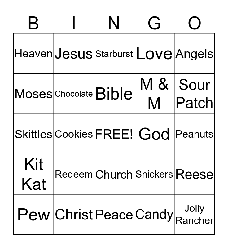 This bingo card has a free space and 24 words: Redeem, Christ, Bible, Pew, Angels, Heaven, Moses, Jesus, God, Church, M & M, Skittles, Snickers, Reese, Chocolate, Candy, Peanuts, Starburst, Sour Patch, Cookies, Jolly Rancher, Kit Kat, Love and Peace.