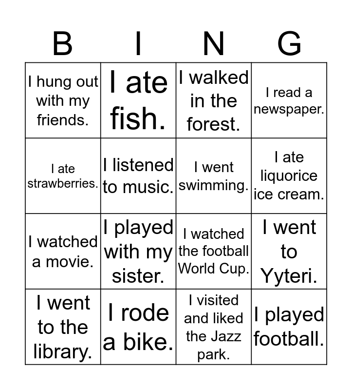 This bingo card has 16 words: I rode a bike., I went to Yyteri., I walked in the forest., I hung out with my friends., I watched a movie., I ate fish., I watched the football World Cup., I visited and liked the Jazz park., I ate strawberries., I listened to music., I went to the library., I read a newspaper., I played with my sister., I ate liquorice ice cream., I went swimming. and I played football..