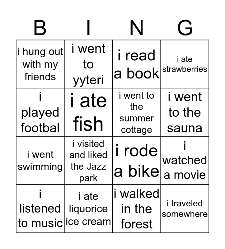 This bingo card has 16 words: i ate liquorice ice cream, i watched a movie, i read a book, i hung out with my friends, i went swimming, i went to yyteri, i rode a bike, i walked in the forest, i played footbal, i ate fish, i listened to music, i ate strawberries, i visited and liked the Jazz park, i went to the sauna, i went to the summer cottage and i traveled somewhere.
