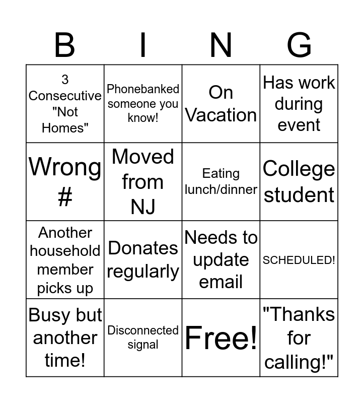 This bingo card has 17 words: Free!, Busy but another time!, On Vacation, 3 Consecutive "Not Homes", Donates regularly, Has work during event, SCHEDULED!, Eating lunch/dinner, College student, Moved from NJ, Disconnected signal, Needs to update email, Wrong #, Phonebanked someone you know!, Another household member picks up, "Can you text or email me the details?" and "Thanks for calling!".