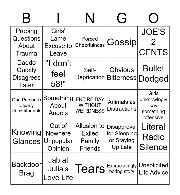 This bingo card has a free space and 24 words: Out of Nowhere Unpopular Opinion, Jab at Julia's Love Life, Self-Deprication, Backdoor Brag, JOE'S 2 CENTS, Probing Questions About Trauma, Daddo Quietly Disagrees Later, Girls' Lame Excuse to Leave, Animals as Distractions, Allusion to Exiled Family Friends, Obvious Bitterness, One Person is Clearly Uncomfortable, Disapproval for Sleeping or Staying Up Late, Literal Radio Silence, "I don't feel 58!", Excruciatingly boring story, Girls unknowingly say something offensive, Forced Cheerfulness, Bullet Dodged, Something About Angels, Unsolicited Life Advice, Knowing Glances, Gossip and Tears.