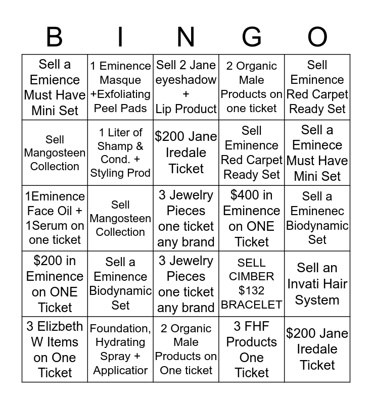 This bingo card has 25 words: Sell a Eminence Biodynamic Set, 2 Organic Male Products on One ticket, $200 Jane Iredale Ticket, 3 Elizbeth W Items on One Ticket, Sell Eminence Red Carpet Ready Set, Sell a Emience Must Have Mini Set, Sell Mangosteen Collection, 1 Eminence Masque +Exfoliating Peel Pads, $400 in Eminence on ONE Ticket, 3 Jewelry Pieces one ticket any brand, Sell Eminence Red Carpet Ready Set, 1Eminence Face Oil + 1Serum on one ticket, SELL CIMBER $132 BRACELET, Sell an Invati Hair System, 1 Liter of Shamp & Cond. + Styling Prod, $200 Jane Iredale Ticket, Sell a Eminenec Biodynamic Set, Sell 2 Jane eyeshadow + Lip Product, Sell a Eminece Must Have Mini Set, Sell Mangosteen Collection, 3 Jewelry Pieces one ticket any brand, Foundation, Hydrating Spray + Applicatior, $200 in Eminence on ONE Ticket, 2 Organic Male Products on one ticket and 3 FHF Products One Ticket.