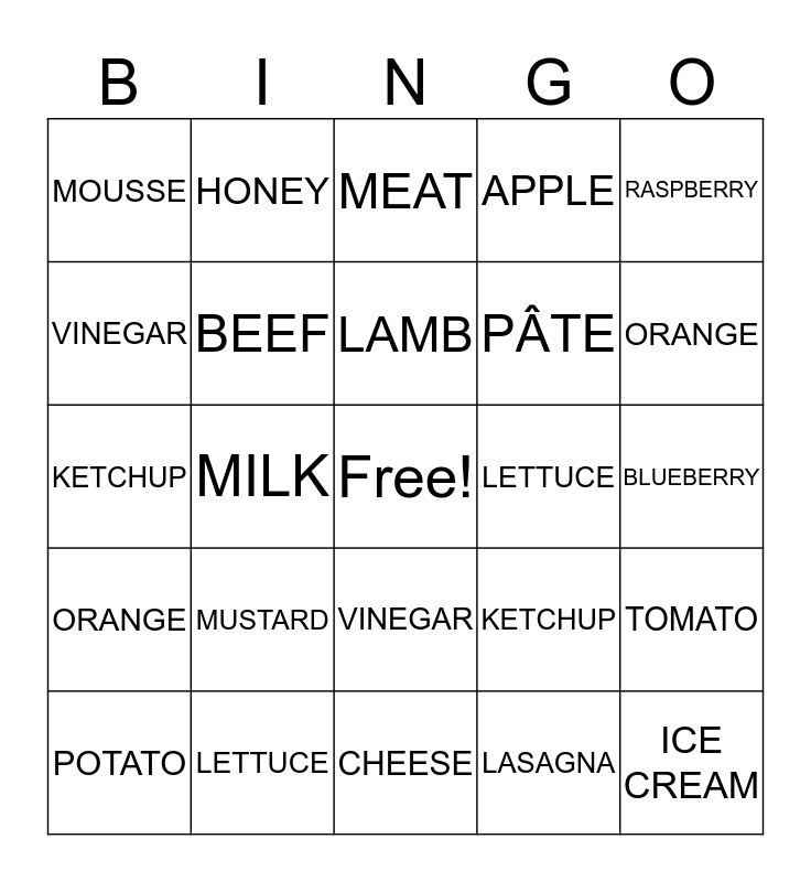 This bingo card has a free space and 60 words: POTATO, LETTUCE, CHEESE, ORANGE, LASAGNA, Strawberry, BEEF, PIE, PÂTE, LASAGNA, APPLE, SOUP, VINEGAR, GRAPES, BANANAS, MOUSSE, ICE CREAM, RASPBERRY, MUSTARD, LAMB, LETTUCE, MEAT, POTATO, TOMATO, BLACKBERRY, OIL, PEACHES, ONION, ORANGE, MILK, PLUMS, PINEAPPLE, FLOOR, CREAM, HONEY, SALAD, STRAWBERRY, MILK, RICE, KETCHUP, CAKE, MUSTARD, BLUEBERRY, GRAPEFRUIT, KETCHUP, CHIPS, TOASTS, RICE, FRUITS, VINEGAR, CHEESE, MUSHROOM, TOMATO, PEARS, CARROT, PEPPER, SOUP, BURGER, Raspberry and HONEY.