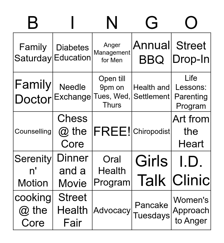 This bingo card has a free space and 24 words: Dinner and a Movie, Street Health Fair, Open till 9pm on Tues, Wed, Thurs, cooking @ the Core, Street Drop-In, Family Saturday, Family Doctor, Diabetes Education, Chiropodist, Oral Health Program, Health and Settlement, Counselling, Girls Talk, I.D. Clinic, Needle Exchange, Pancake Tuesdays, Art from the Heart, Anger Management for Men, Life Lessons: Parenting Program, Chess @ the Core, Women's Approach to Anger, Serenity n' Motion, Annual BBQ and Advocacy.