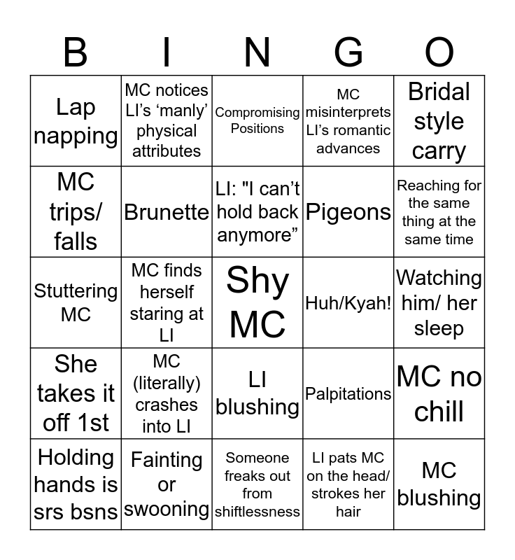 This bingo card has a free space and 24 words: MC (literally) crashes into LI, Fainting or swooning, LI: "I can’t hold back anymore”, Holding hands is srs bsns, Bridal style carry, Lap napping, MC trips/ falls, MC notices LI’s ‘manly’ physical attributes, Huh/Kyah!, LI blushing, Pigeons, Stuttering MC, Palpitations, MC no chill, Brunette, LI pats MC on the head/ strokes her hair, Watching him/ her sleep, Compromising Positions, Reaching for the same thing at the same time, MC finds herself staring at LI, MC blushing, She takes it off 1st, MC misinterprets LI’s romantic advances and Someone freaks out from shiftlessness.