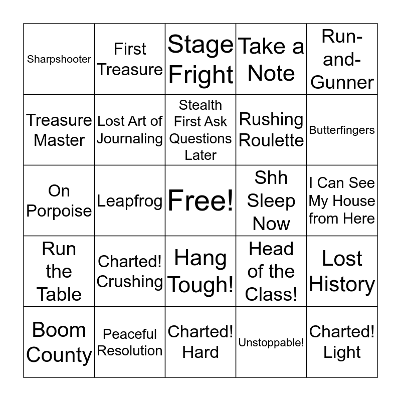 This bingo card has a free space and 48 words: Charted! Explorer, Charted! Light, Charted! Moderate, Charted! Hard, Charted! Crushing, Charted! Speedrun, First Treasure, Treasure Hunter, Treasure Master, Jot This Down, Lost Art of Journaling, Take a Note, Lost History, Head of the Class!, You Have a Head for this Business, Hangman’s Bullet, Stealth First Ask Questions Later, Shh Sleep Now, I Thought I Heard Something, Run-and-Gunner, Leapfrog, Unstoppable!, Sharpshooter, Rushing Roulette, Ghost in the Cemetery, Butterfingers, Boom County, Defeat 10 in 60 China Lake GL, Hang Tough!, Run the Table, Hitting a Brick Wall, Wingman, Cliffhanger, Relic Finder, Peaceful Resolution, Don’t Feed the Animals, Not a Cairn in the World, I Can See My House from Here, Trials and Tribulations, Best Score!, Gift of Gab, Marco Polo Returns!, Stage Fright, Just Floor It, On Porpoise, Still Got It, Glamour Shot and Swordmaster.