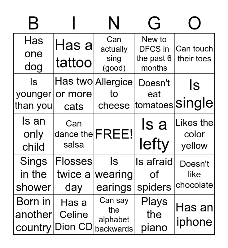 This bingo card has a free space and 24 words: Flosses twice a day, Has a Celine Dion CD, Allergice to cheese, Born in another country, Can touch their toes, Has one dog, Is younger than you, Has a tattoo, Is a lefty, Is wearing earings, Doesn't eat tomatoes, Is an only child, Is afraid of spiders, Doesn't like chocolate, Has two or more cats, Plays the piano, Likes the color yellow, Can actually sing (good), Is single, Can dance the salsa, Has an iphone, Sings in the shower, New to DFCS in the past 6 months and Can say the alphabet backwards.