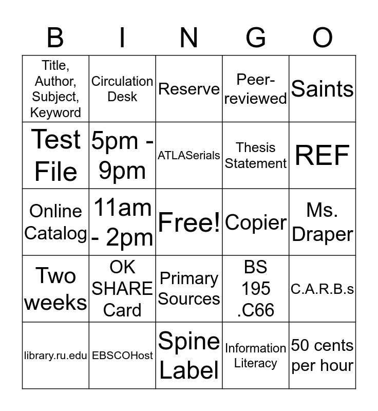 This bingo card has a free space and 24 words: OK SHARE Card, EBSCOHost, ATLASerials, library.ru.edu, Saints, Title, Author, Subject, Keyword, Test File, Circulation Desk, Copier, Primary Sources, Thesis Statement, Online Catalog, BS 195 .C66, C.A.R.B.s, 5pm - 9pm, Information Literacy, Ms. Draper, Reserve, REF, 11am - 2pm, 50 cents per hour, Two weeks, Peer-reviewed and Spine Label.
