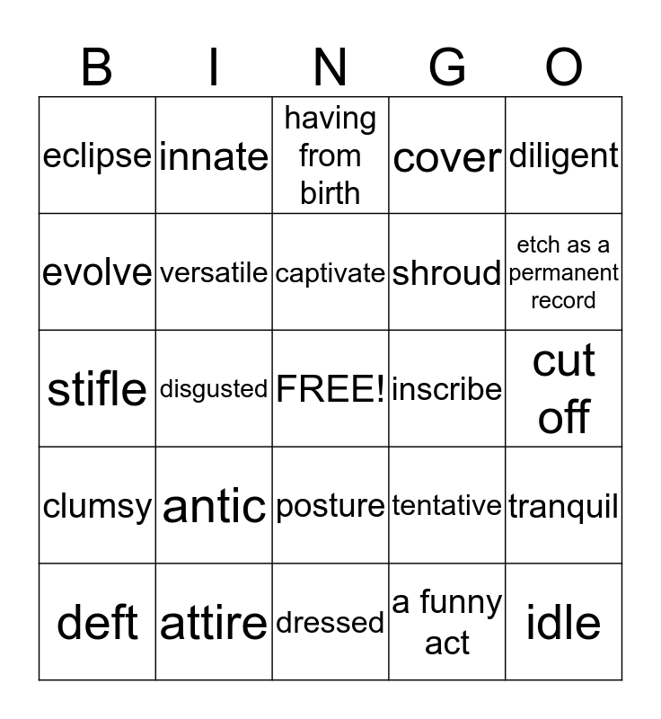 This bingo card has a free space and 24 words: antic, attire, captivate, deft, diligent, eclipse, evolve, innate, inscribe, posture, shroud, stifle, tentative, tranquil, versatile, a funny act, cut off, having from birth, etch as a permanent record, disgusted, idle, clumsy, cover and dressed.