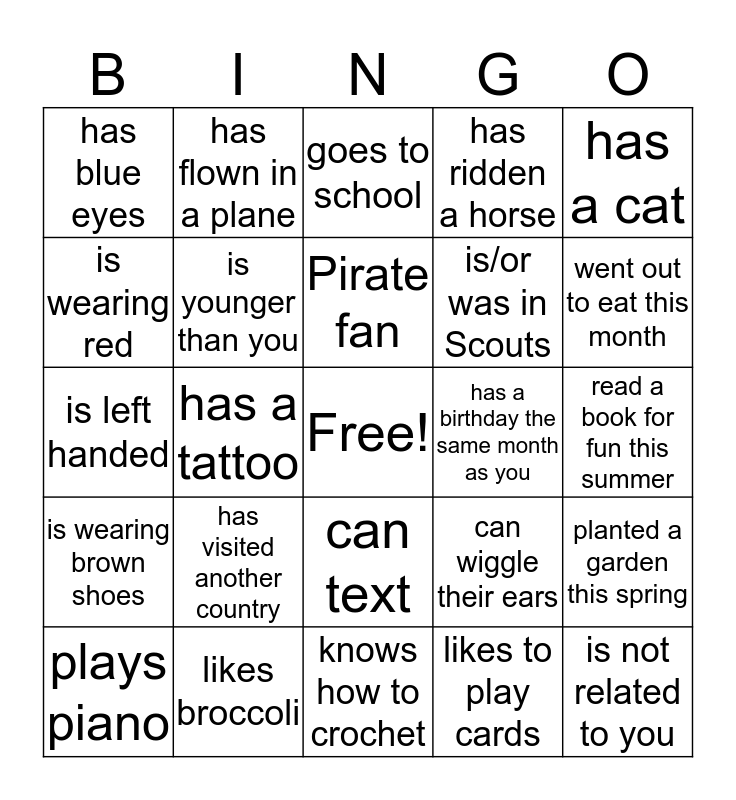 This bingo card has a free space and 24 words: has visited another country, likes broccoli, Pirate fan, plays piano, has a cat, has blue eyes, is wearing red, has flown in a plane, has a birthday the same month as you, can text, is/or was in Scouts, is left handed, can wiggle their ears, planted a garden this spring, is younger than you, likes to play cards, read a book for fun this summer, goes to school, went out to eat this month, has a tattoo, is not related to you, is wearing brown shoes, has ridden a horse and knows how to crochet.