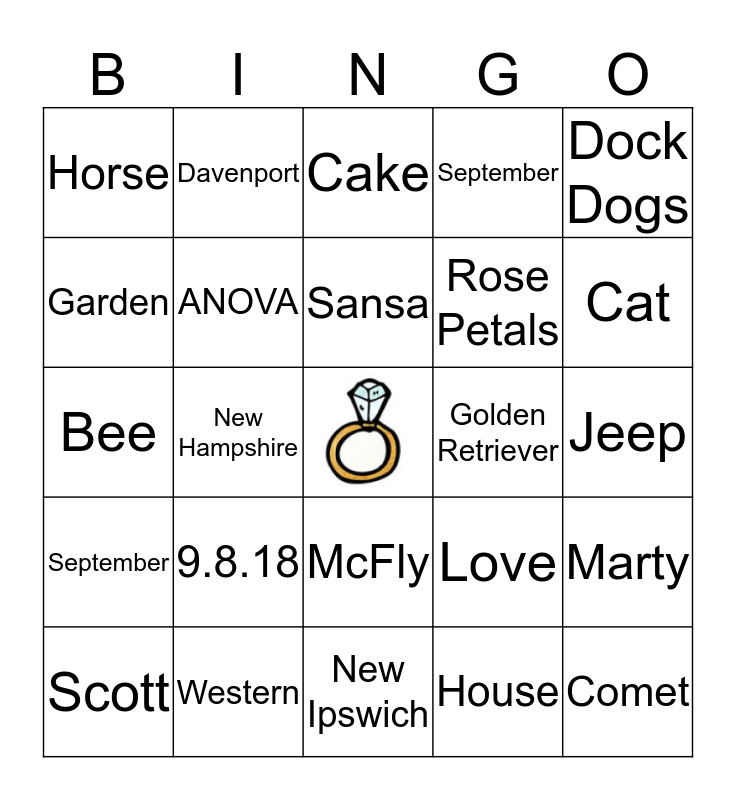 This bingo card has a free space and 33 words: Marty, Vermont, New Hampshire, Kayaking, September, ANOVA, Dock Dogs, Scott, Davenport, Kayleigh, Sansa, Cake, Chocolate, YES!, Golden Retriever, Cat, Western, Bee, 9.8.18, Love, McFly, Sansa, Horse, Jeep, New Ipswich, Comet, September, Rose Petals, Garden, Marty, Sunflower, House and Camping.