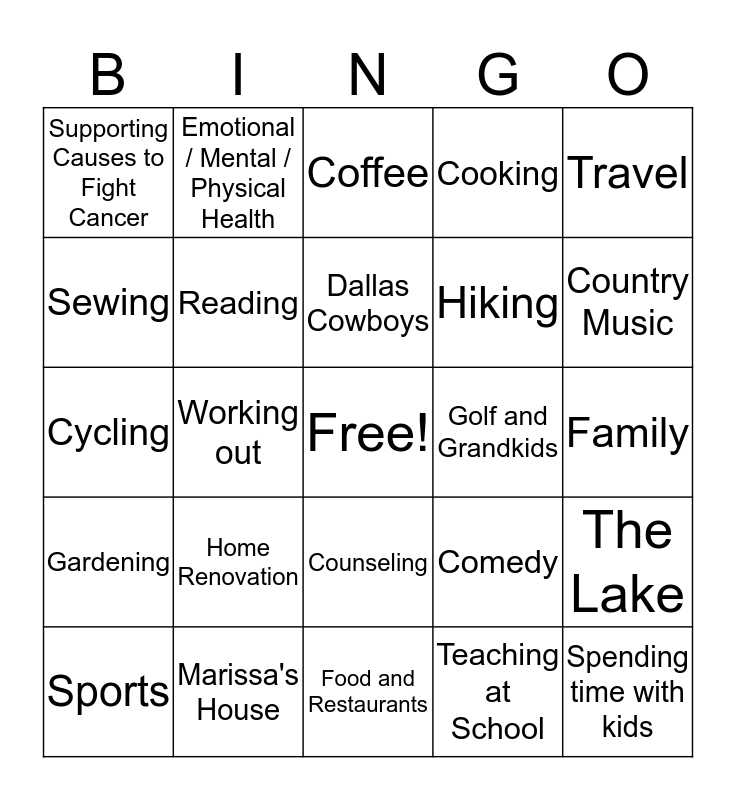 This bingo card has a free space and 24 words: Home Renovation, Marissa's House, Dallas Cowboys, Sports, Travel, Supporting Causes to Fight Cancer, Sewing, Emotional / Mental / Physical Health, Golf and Grandkids, Counseling, Hiking, Cycling, Comedy, The Lake, Reading, Teaching at School, Family, Coffee, Country Music, Working out, Spending time with kids, Gardening, Cooking and Food and Restaurants.