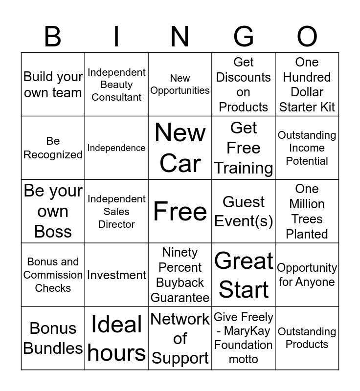 This bingo card has a free space and 24 words: Bonus Bundles, Investment, New Car, Give Freely - MaryKay Foundation motto, One Hundred Dollar Starter Kit, Build your own team, Independent Beauty Consultant, New Opportunities, Guest Event(s), One Million Trees Planted, Be your own Boss, Independence, Great Start, Opportunity for Anyone, Be Recognized, Ideal hours, Network of Support, Get Discounts on Products, Outstanding Income Potential, Bonus and Commission Checks, Independent Sales Director, Ninety Percent Buyback Guarantee, Get Free Training and Outstanding Products.