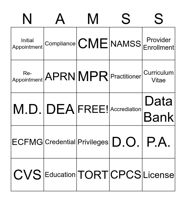 This bingo card has a free space and 25 words: Credential, TORT, MPR, CVS, Provider Enrollment, Initial Appointment, Re-Appointment, Compliance, Accrediation, Privileges, Practitioner, M.D., D.O., P.A., APRN, Primary Source, Data Bank, CME, Curriculum Vitae, DEA, License, Education, ECFMG, NAMSS and CPCS.