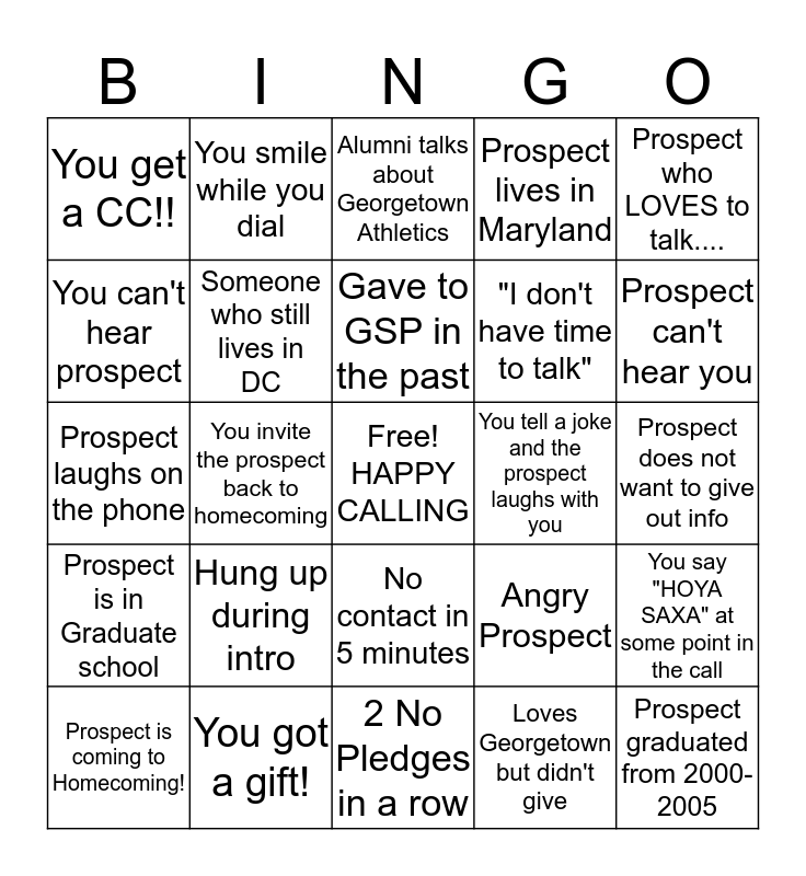 This bingo card has a free space and 24 words: Hung up during intro, You got a gift!, Gave to GSP in the past, Prospect is coming to Homecoming!, Prospect who LOVES to talk...., You get a CC!!, You can't hear prospect, You smile while you dial, You tell a joke and the prospect laughs with you, No contact in 5 minutes, "I don't have time to talk", Prospect laughs on the phone, Angry Prospect, You say "HOYA SAXA" at some point in the call, Someone who still lives in DC, Loves Georgetown but didn't give, Prospect does not want to give out info, Alumni talks about Georgetown Athletics, Prospect can't hear you, You invite the prospect back to homecoming, Prospect graduated from 2000-2005, Prospect is in Graduate school, Prospect lives in Maryland and 2 No Pledges in a row.