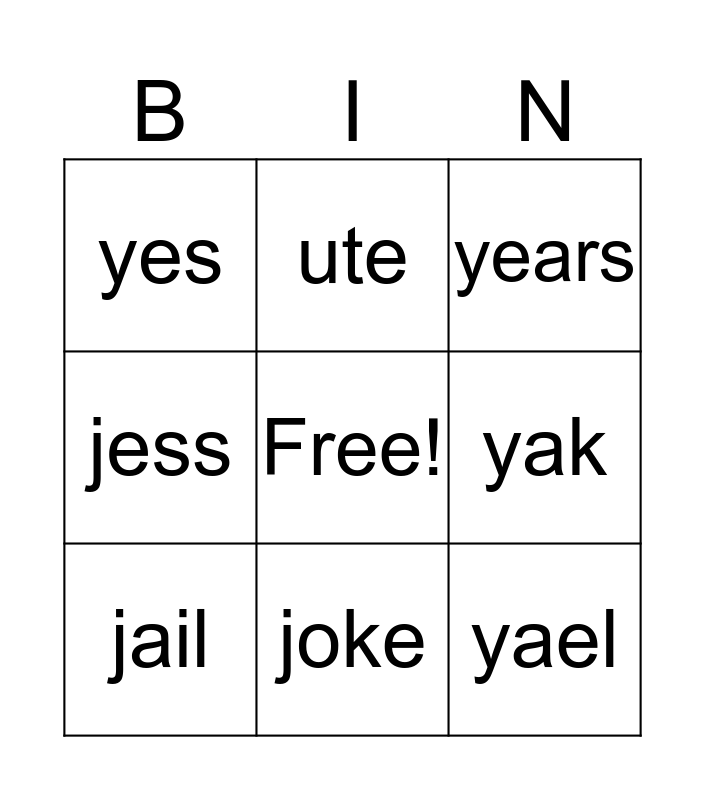 This bingo card has a free space and 8 words: jess, ute, yak, jail, years, yes, joke and yael.