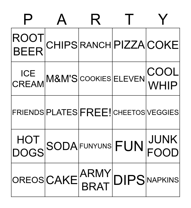 This bingo card has a free space and 24 words: SODA, CAKE, COOKIES, OREOS, COKE, ROOT BEER, ICE CREAM, CHIPS, CHEETOS, FUNYUNS, ELEVEN, FRIENDS, FUN, JUNK FOOD, M&M'S, DIPS, VEGGIES, RANCH, COOL WHIP, PLATES, NAPKINS, HOT DOGS, PIZZA and ARMY BRAT.