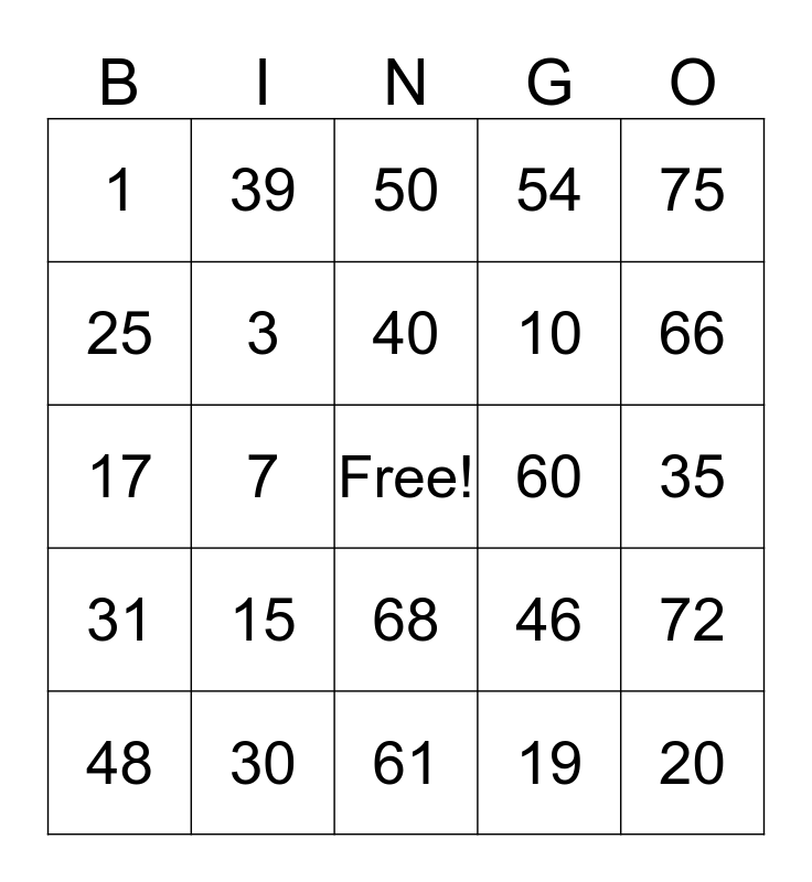 This bingo card has a free space and 24 words: 15, 30, 40, 48, 75, 1, 25, 39, 60, 68, 10, 17, 46, 72, 3, 19, 35, 50, 66, 7, 20, 31, 54 and 61.