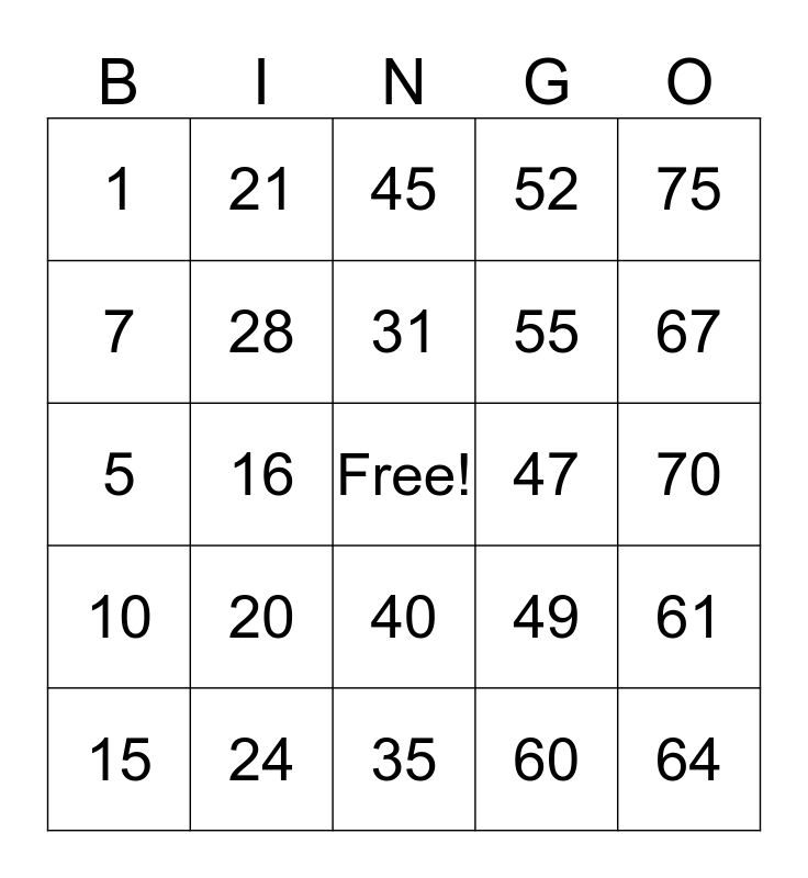 This bingo card has a free space and 24 words: 15, 20, 31, 60, 75, 1, 21, 45, 47, 70, 5, 28, 49, 61, 7, 24, 35, 52, 67, 10, 16, 40, 55 and 64.