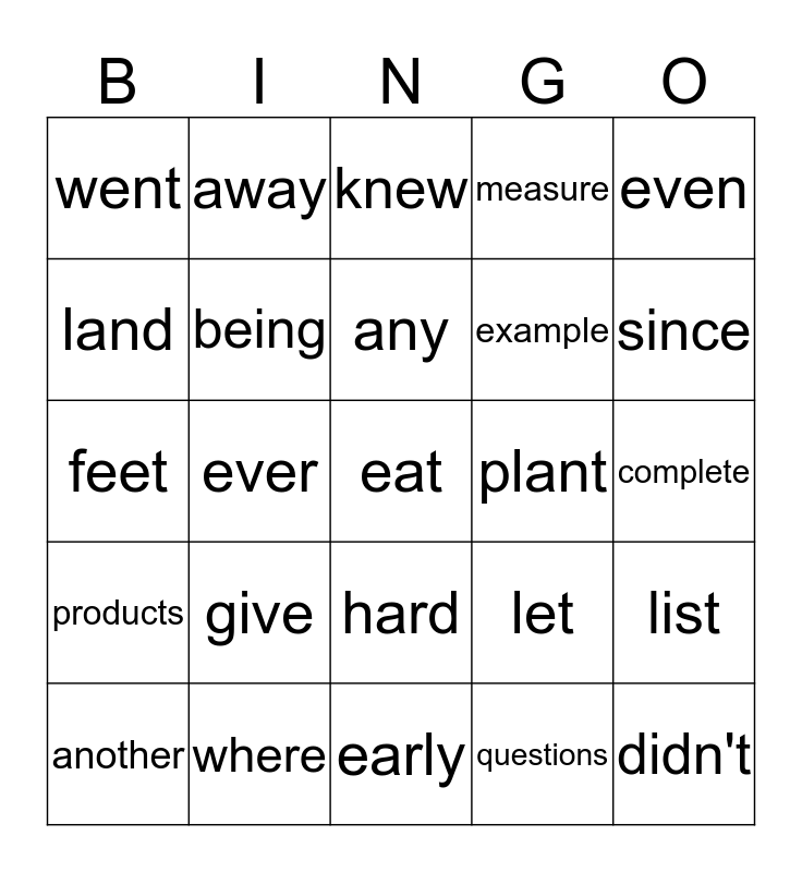 This bingo card has a free space and 24 words: give, where, any, another, even, went, land, away, plant, hard, example, feet, let, list, being, questions, complete, knew, since, ever, didn't, products, measure and early.