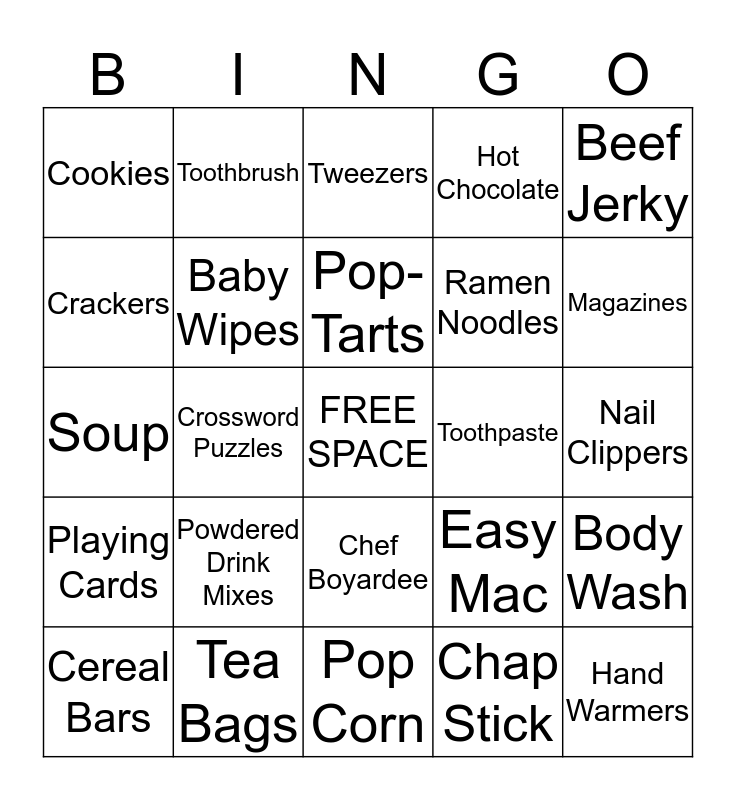 This bingo card has a free space and 24 words: Powdered Drink Mixes, Tea Bags, Pop-Tarts, Cereal Bars, Beef Jerky, Cookies, Crackers, Toothbrush, Toothpaste, Chef Boyardee, Ramen Noodles, Soup, Easy Mac, Body Wash, Baby Wipes, Chap Stick, Nail Clippers, Tweezers, Magazines, Crossword Puzzles, Hand Warmers, Playing Cards, Hot Chocolate and Pop Corn.